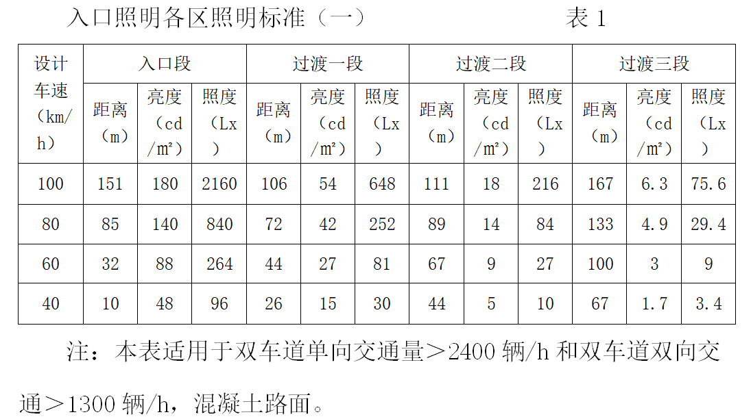 如果是大于100m的隧道,在接近隧道時可以看到隧道的出口,這樣就出現了黑框現象。為了避免這種現象對行車的影響,設置照明時應采取比表1、表2更高的亮度標準。