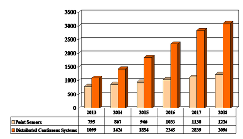 作為物聯網極其重要的組成部分之一,光纖傳感器因其優勢與應用一直備受矚目。從全球市場來看,2013年全球光纖傳感器市場規模為18.9億美元。預計2014至2018年,全球光纖傳感器市場將以年均18%的增長幅度增長,至2018年市場規模達到43.3億美元。從光纖傳感技術研究上看,美國對該技術的研究起步最早,且在世界上最為先進。